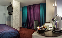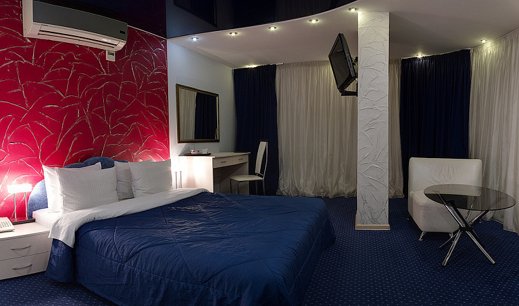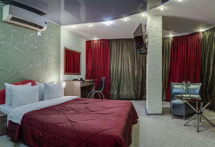 Просторный однокомнатный номер площадью до 38 кв.м. с панорамным видом на город. В номерах категории джуниор-сюит «Делюкс» большие двуспальные кровати и кровати размера King Size с ортопедическими матрацами. В распоряжении гостей телевизор, спутниковое телевидение, WI-FI, кондиционер, холодильник, шкаф для одежды, рабочая зона с письменным столом и стулом, а также зона отдыха с креслами и журнальным столиком. Для удобства в номере чайник и бесплатные: чай, кофе и минеральная вода.