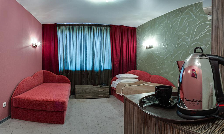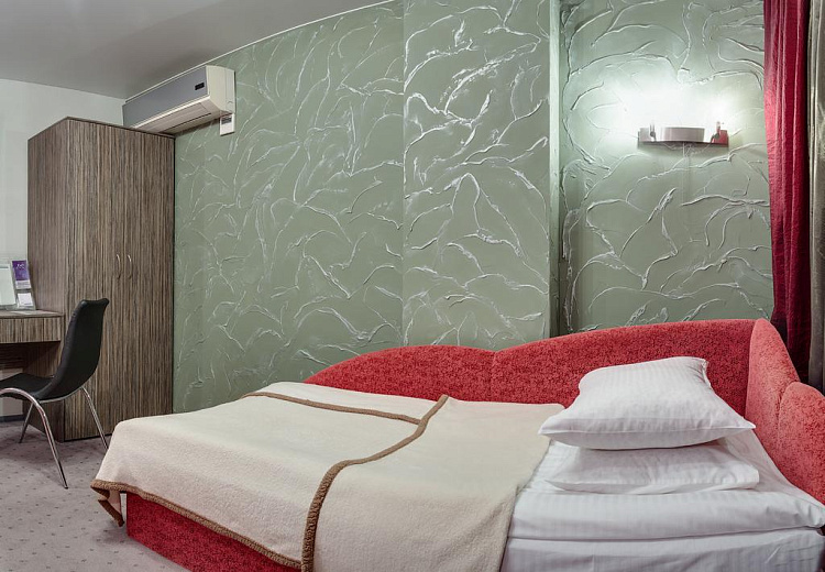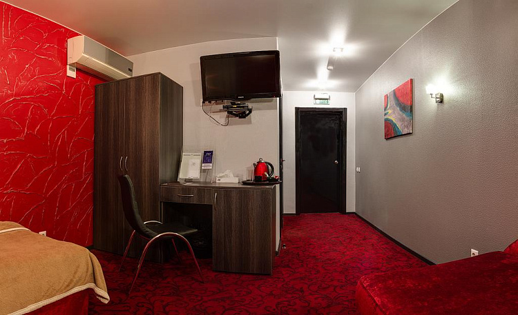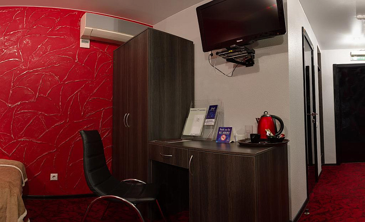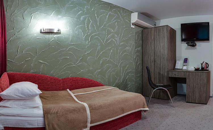Комфортный номер площадью до 21 кв.м. с видом на город. Каждый номер первой категории «Твин» оснащен двумя раздельно стоящими односпальными диван-кроватями с ортопедическими матрацами. В распоряжении гостей телевизор, спутниковое телевидение, WI-FI, кондиционер, шкаф для одежды, рабочая зона с письменным столом и стулом. Для удобства в номере чайник и бесплатные: чай, кофе и минеральная вода. В ванной комнате к Вашим услугам душевая кабина, фен, халат, тапочки, туалет, туалетные принадлежности.