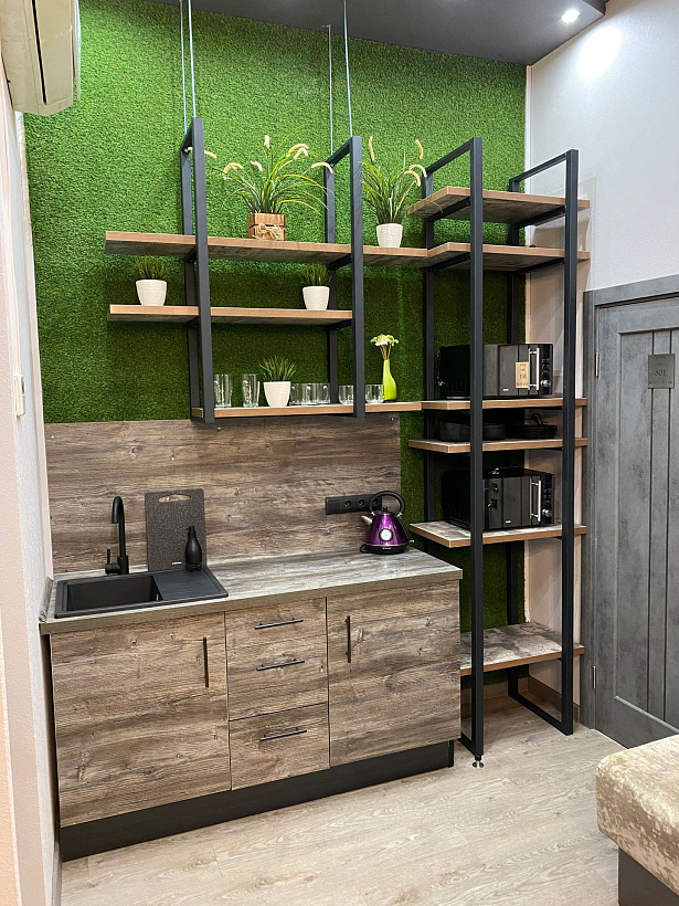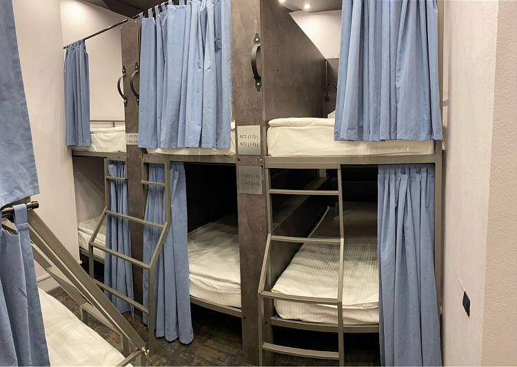 Современный многоместный номер пятой категории в стиле "Лофт" предназначенный для проживания 5-ти мужчин. В номере 3 двух-ярусных кровати. У каждой свой индивидуальный шкаф для хранения вещей. Внутри каждой кровати оборудована полочка для телефона. Двойной свет, общий и для чтения. Каждая кровать полностью закрывается шторами. Душевые кабины и туалеты для общего пользования. Есть общая зона отдыха с панорамным видом на город. Большой балкон с деревянной мебелью. Кухня, телевизор, диваны, барная стойка, холодильник, стиральная машина и другое. Интересный дизайн, свежие решения.
